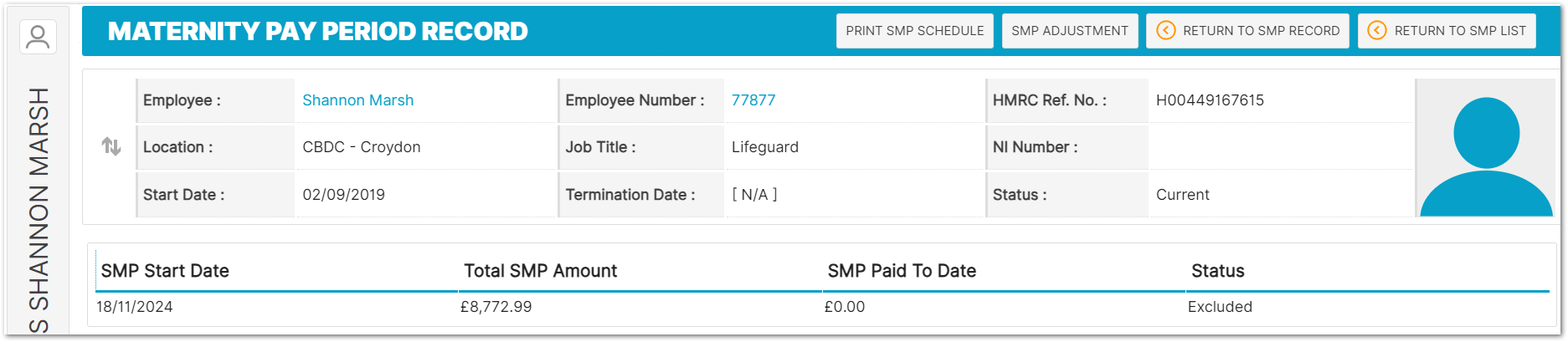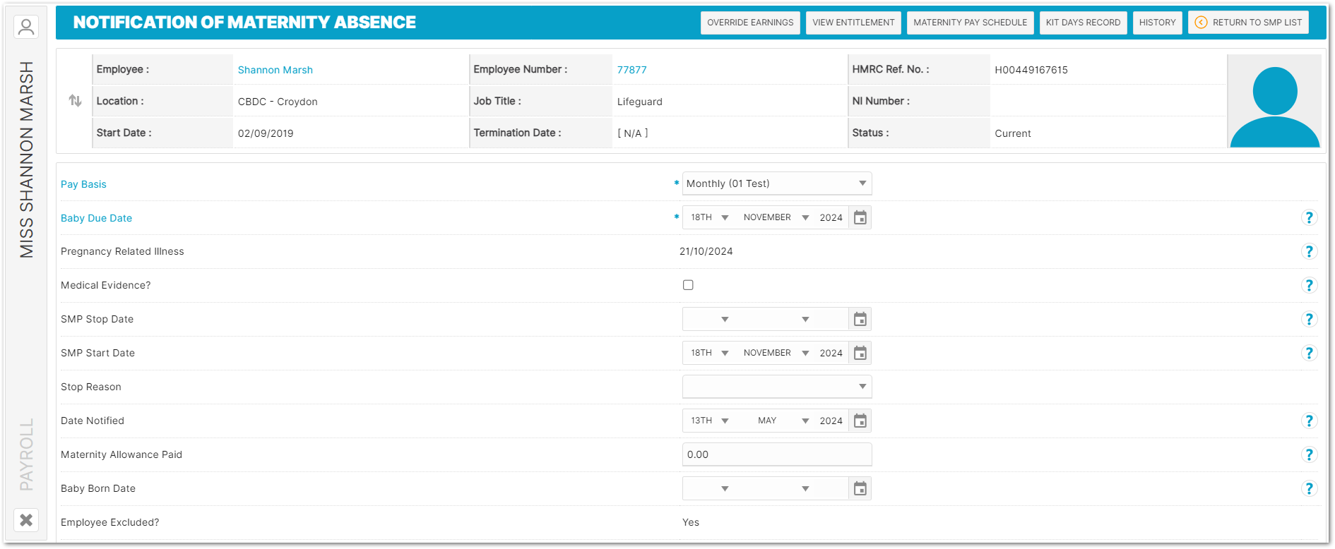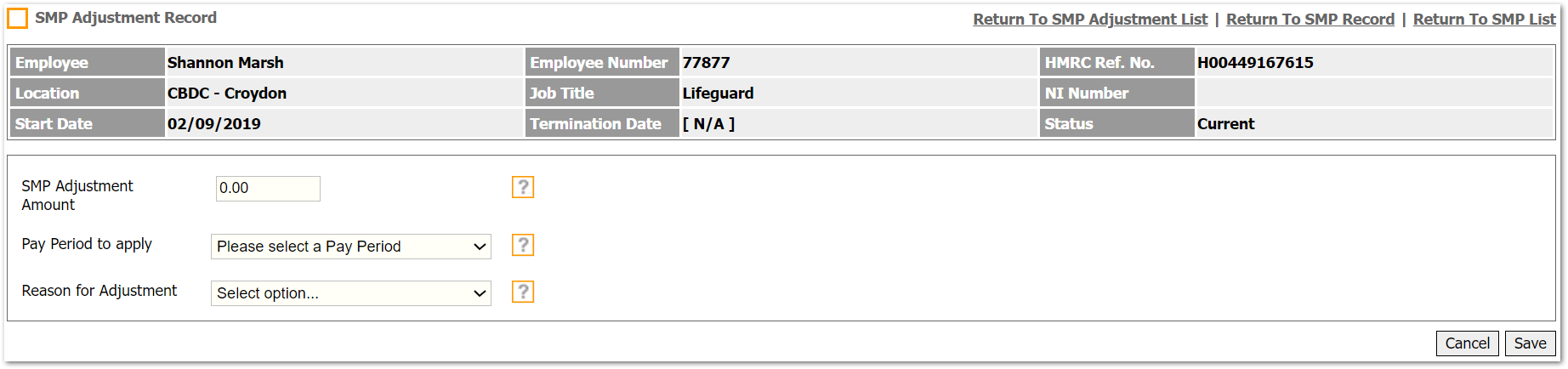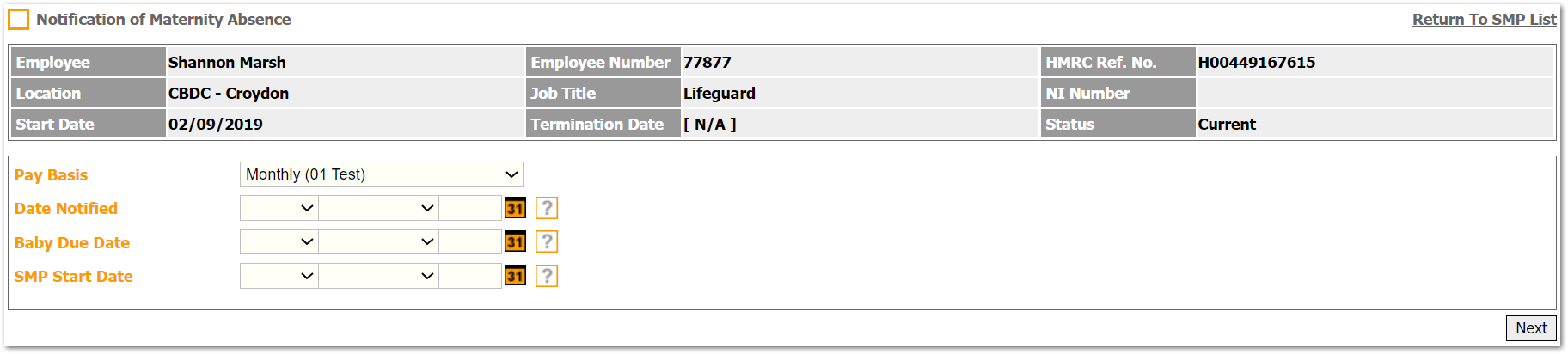 - To access this page, go to Payroll > Employees > Employee List > Find Employee > Employee Payroll Info > Statutory Maternity Pay > Select SMP Record from the List