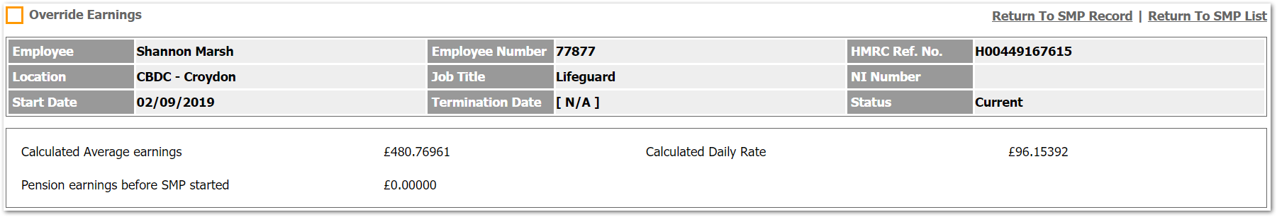 - To access this page, go to Payroll > Employees > Employee List > Find Employee > Employee Payroll Info > Statutory Maternity Pay > Select SMP Record from the List > Override Earnings