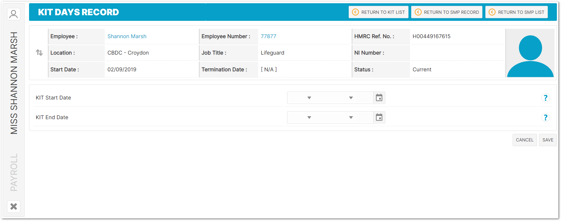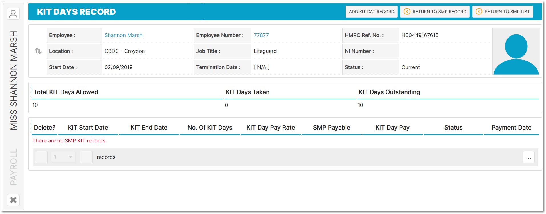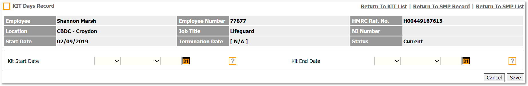 - To access this page, go to Payroll > Employees > Employee List > Find Employee > Employee Payroll Info > Statutory Maternity Pay > Select SMP Record from the List > KIT Days Record > Add KIT Day Record