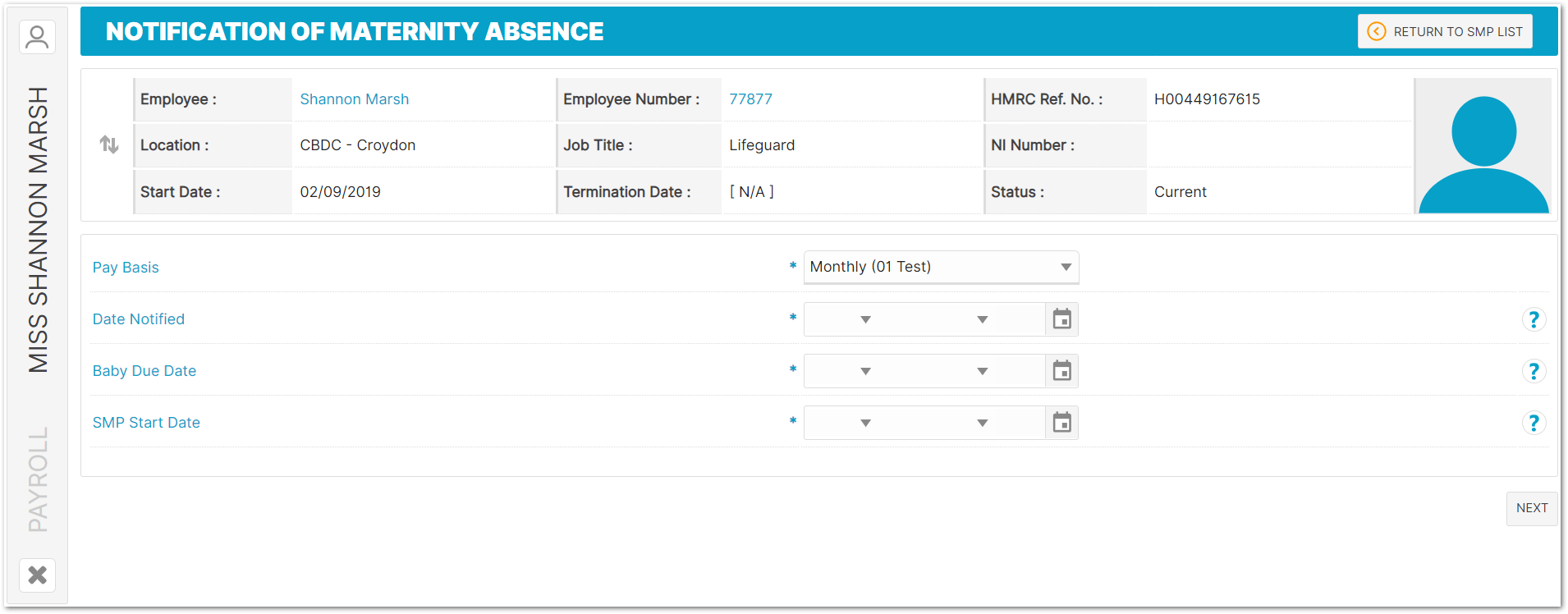 - To access this page, go to Payroll > Employees > Employee List > Find Employee > Employee Payroll Info > Statutory Maternity Pay > Add SMP Record