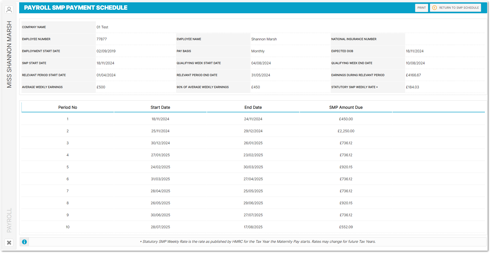 - To access this page, go to Payroll > Employees > Employee List > Find Employee > Employee Payroll Info > Statutory Maternity Pay > Select SMP Record from the List > Maternity Pay Schedule > Print SMP Schedule
