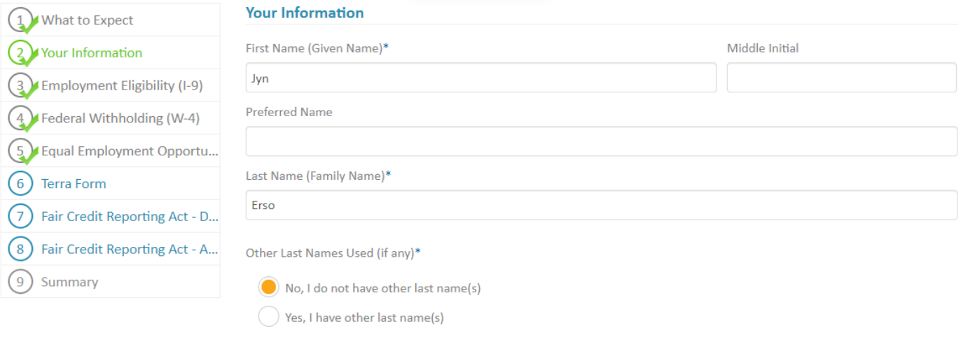 The option for new hires to enter a preferred name when completing the Your Information step.