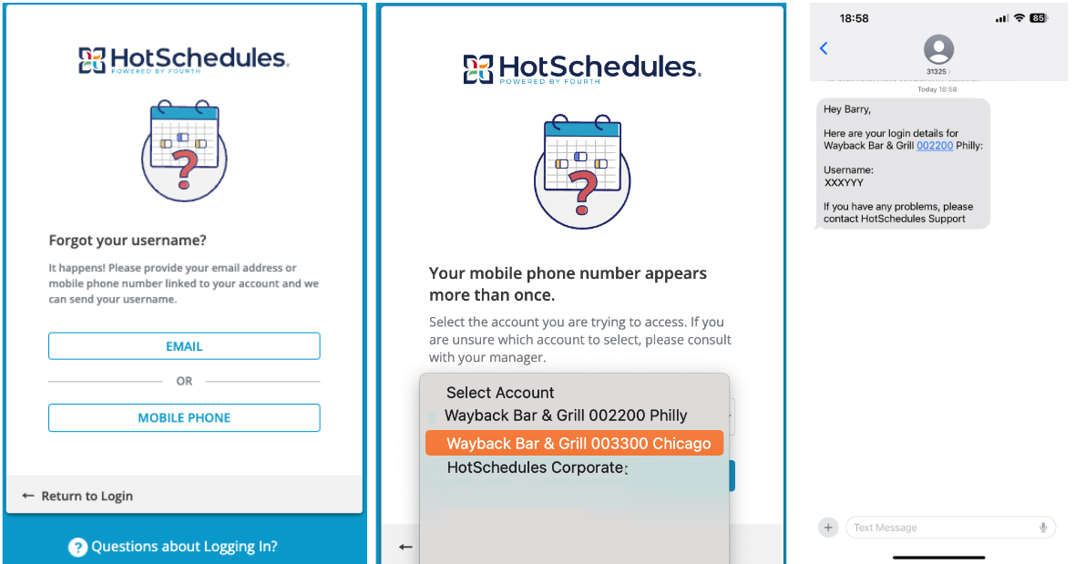 To streamline the ability for users to reset their password by giving them another avenue to reset their password as well as to minimize the need to contact Customer Support for assistance. Users can now retrieve their user name and reset their password by entering their associated mobile number. Users will receive a rest link via SMS to their mobile phone. When a password is reset, users will automatically logged out of the HotSchedules mobile app if they are currently logged in.