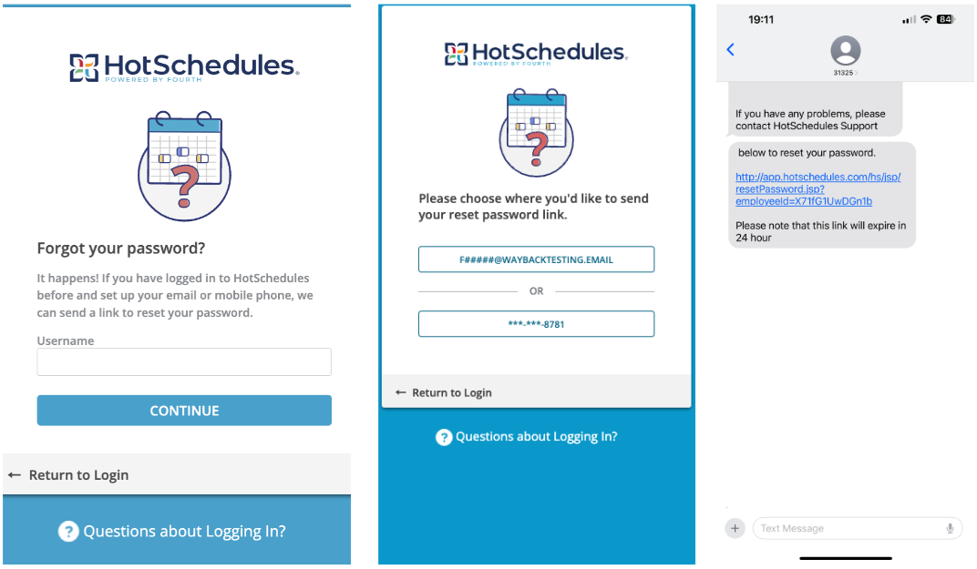 Clicking "Forgot Password" now offers the option to receive a reset link via mobile phone. Note that the username must be known, if the username is associated with an active account, the reset link can be sent to either the email address or the mobile number linked to the account. If the mobile number is selected, an SMS message with a reset link will be sent. The link is valid for 24 hours. After the password is reset, the account will be automatically logged out of the HotSchedules mobile app.
