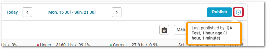 Where previously it would display the date and time of a schedule's publication, the 'Published' tooltip will now show how long since the schedule was published. For example, instead of 'Published on 12th August 2024 at 10:30 AM', the tooltip will now read 'Published 5 minutes ago'. The 'last published by' user will continue to be displayed.