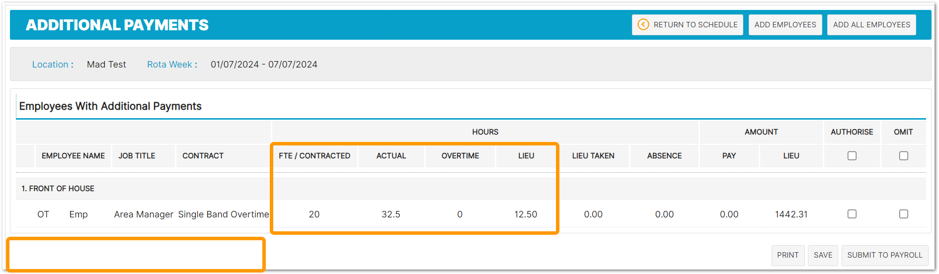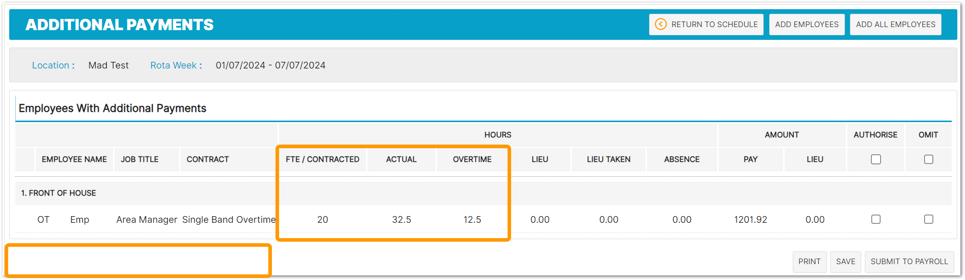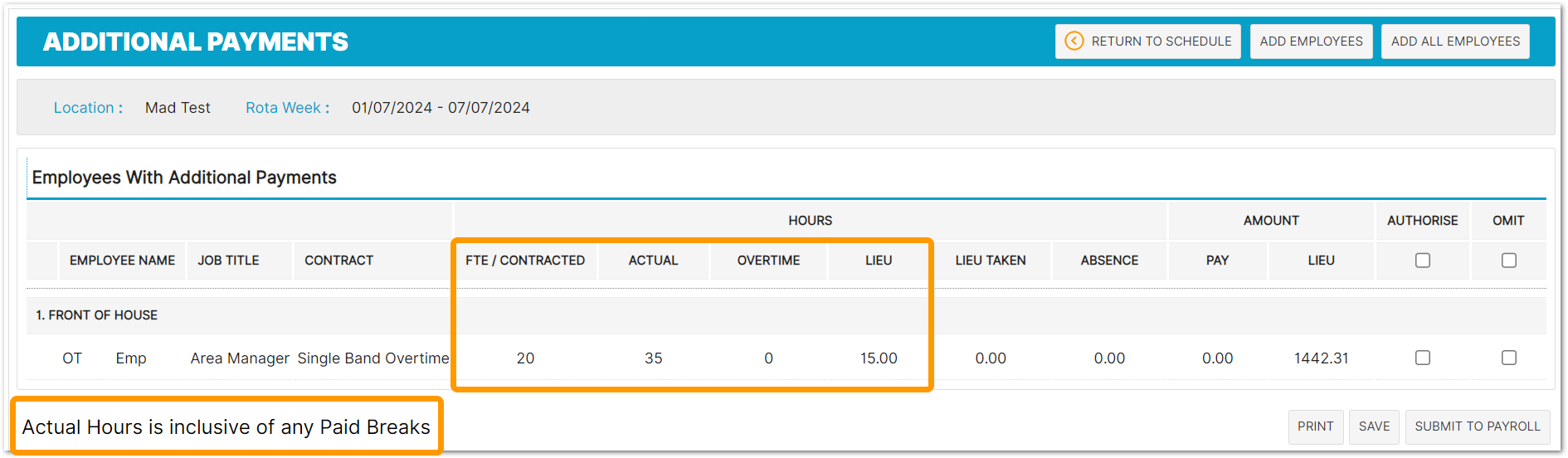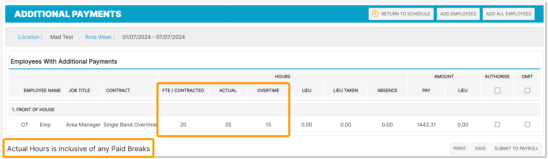 Once the new Global Setting is enabled, any paid break values will be included in the total 'Actual Hours'. Using the 'Additional Payments' screen shown when submitting a schedule/rota. This can be seen by comparing the screen with the new setting on and off.