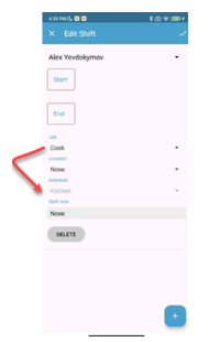 When creating or editing shifts via the mobile app, the app will now automatically apply the correct job and scheduling mapping. For example, when the job "Cook" is selected, the app will default to the corresponding schedule, such as "Kitchen".