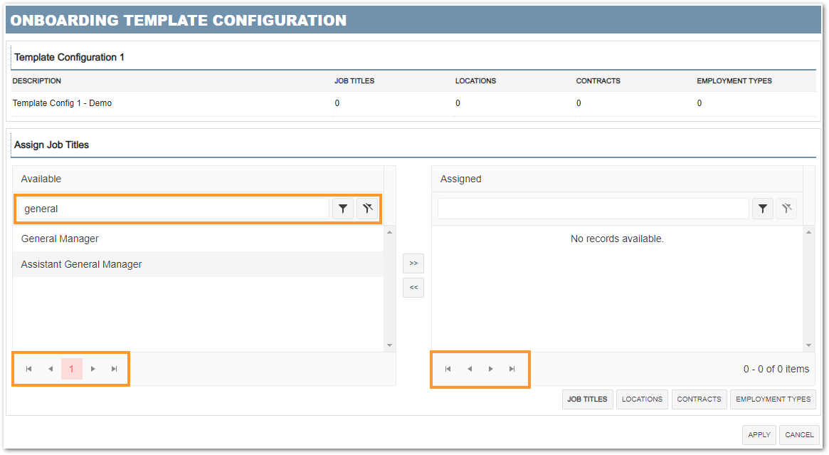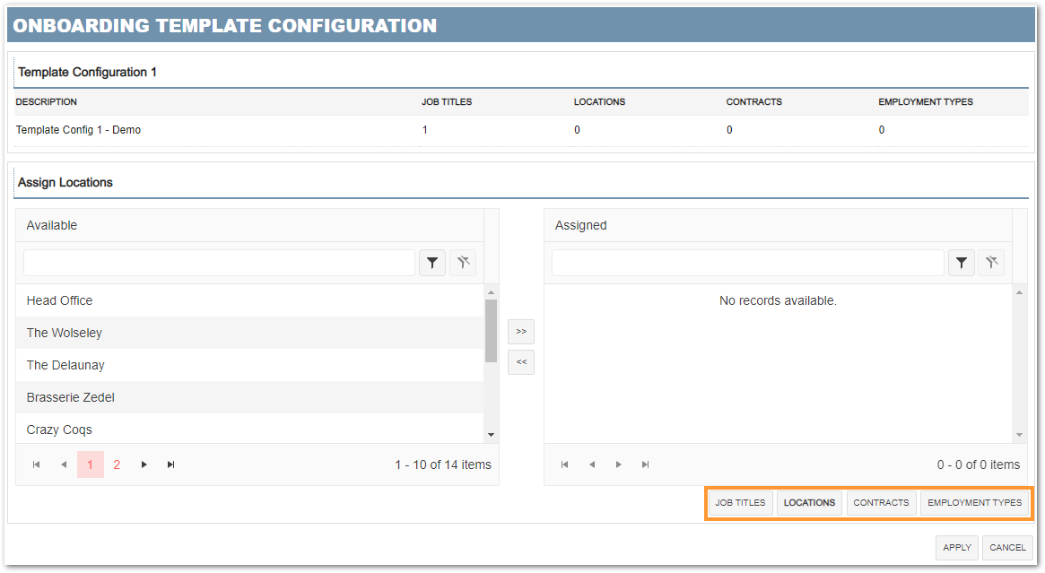 - Once the necessary Job Titles have been assigned, move on to assign Locations, Contracts and Employment Types or return to Job Titles by using the named buttons