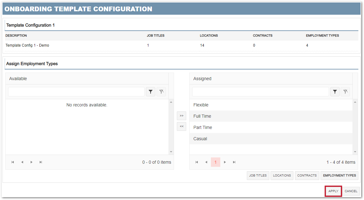 - The same process can be completed for Locations, Contracts and Employment Types as it was done with Job titles. Once the necessary selections have been made, select Apply
