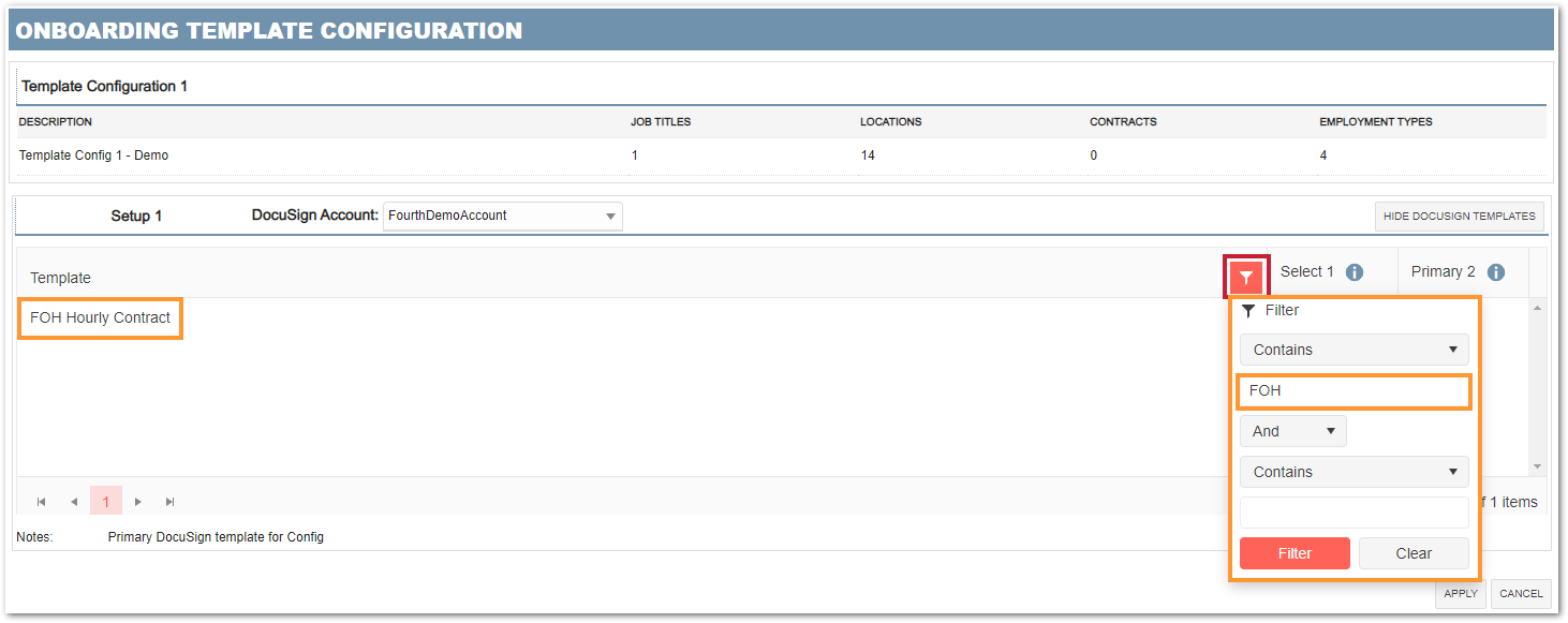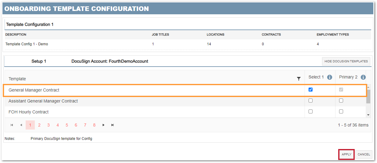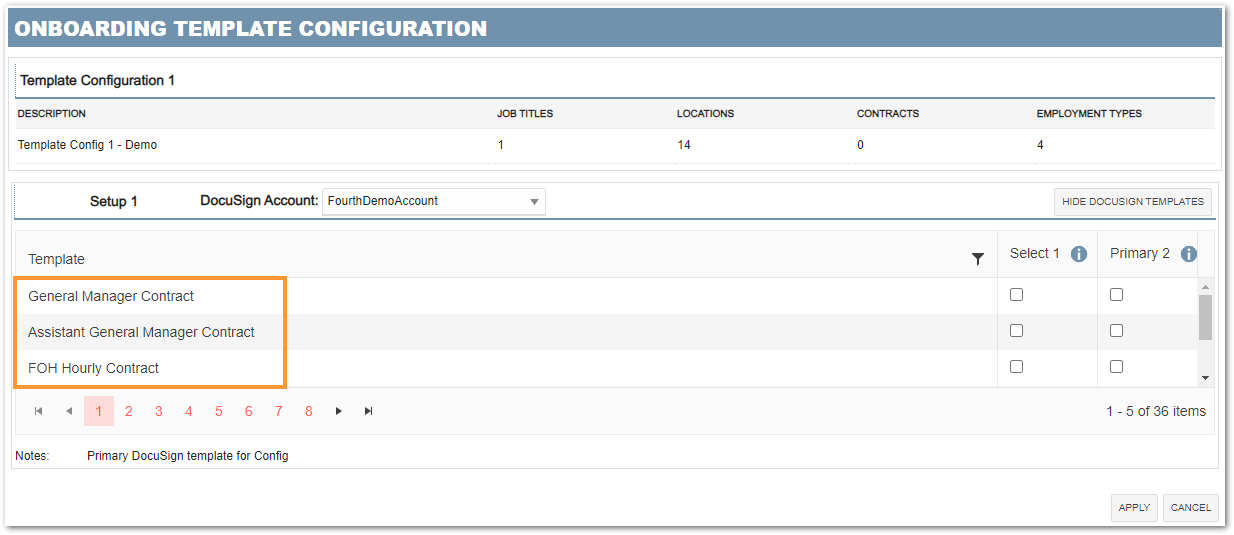 - From the list of DocuSign templates, click Select next to each document that would be included in the envelope sent to the employee. At least one document, and only one, can be selected as Primary and this will be the template that provides the subject and body of the email sent to the employee by DocuSign