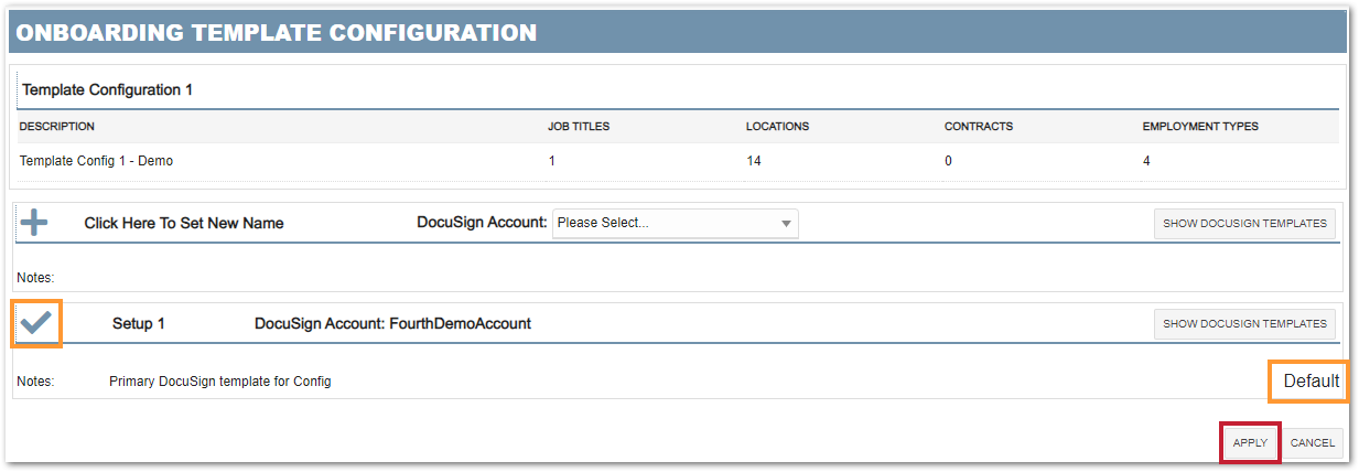 Within a template configuration for Onboarding, many individual configurations of assigned DocuSign templates can be applied but only one can be the default and will be the only one that is used by Onboarding for this configuration.