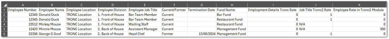 - Fund Name: The TRONC fund the employee is assigned to (this can be multiple which will result in a separate row for each fund the employee is in)