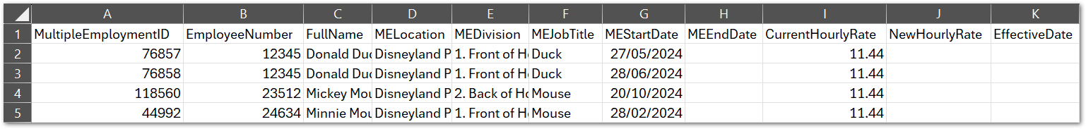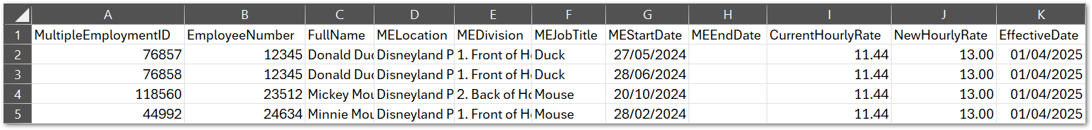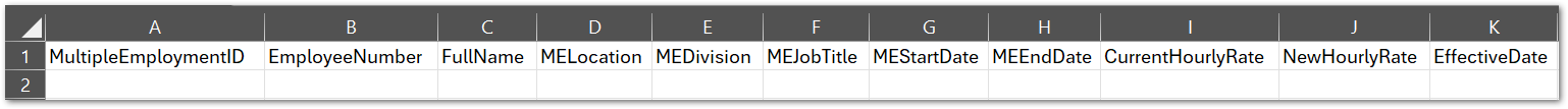 - NewHourlyRate - what the user wants the hourly rate to be updated to in the employee's multiple employment. This is the only field that will change anything regarding a multiple employment