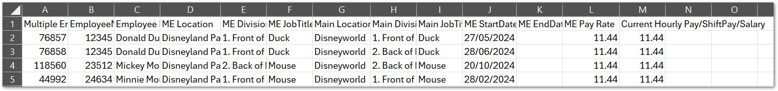 - Alternatively, in the ME Report, delete columns Main Location (Column G), Main Division (Column H), Main Job Title (Column I) and Current Hourly Pay/Shift Pay/Salary (Column M) and then copy everything (excluding the headers) from the ME Report to the Multiple Employment Batch CSV Upload template