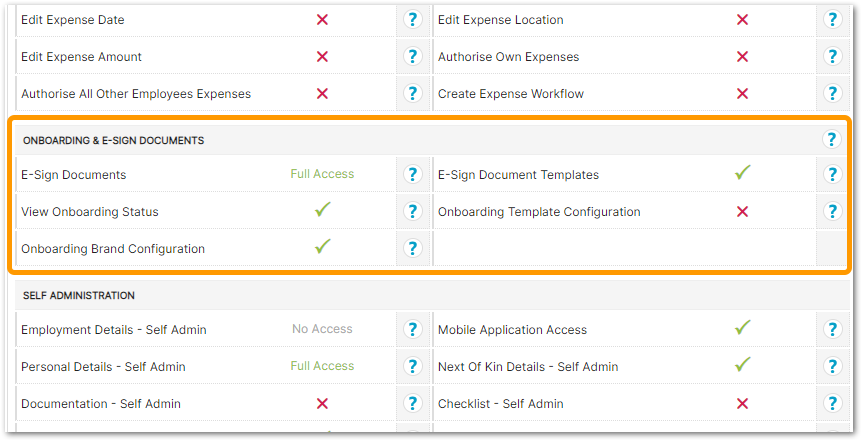 A new 'Onboarding & E-Sign Documents' section has been added to the User Access Summary page, to contain the related permissions settings.