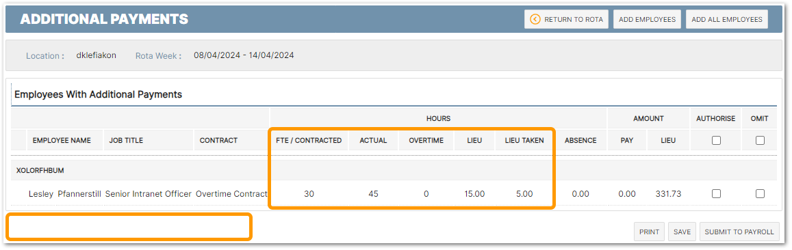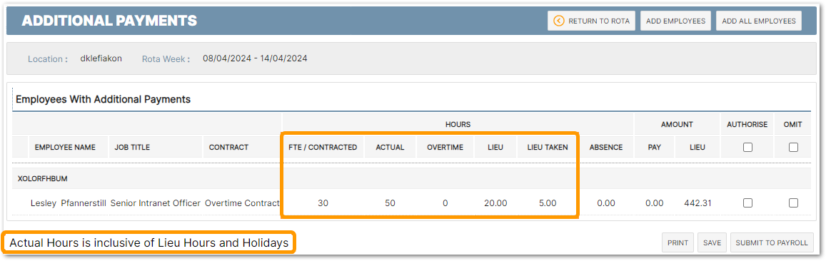If instead of Overtime, the portal is using the Lieu Hours functionality then once the new Global Setting is enabled, any lieu hours values will now be included in the Total Actual Hours. Using the 'Additional Payments' screen when submitting a schedule/rota, this can be seen by comparing the new setting switched on and off: