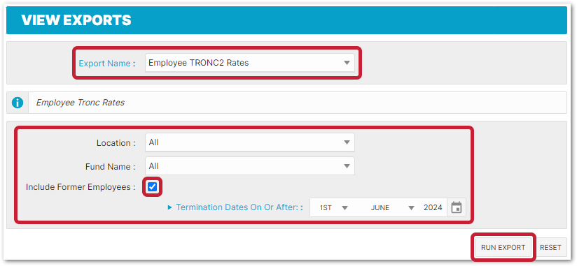 - Select the Employee TRONC2 Rates export: