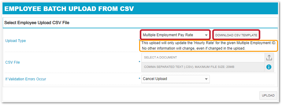 Please note: A message will appear below this box. The message is to mitigate any misleading that this upload will change anything regarding Multiple Employment outside of the pay rate. Apart from the pay rate, Multiple employment records cannot be changed, started or stopped via this upload.