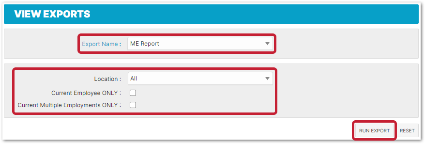- This export can be located by going to HR > Reports > Exports > ME Report