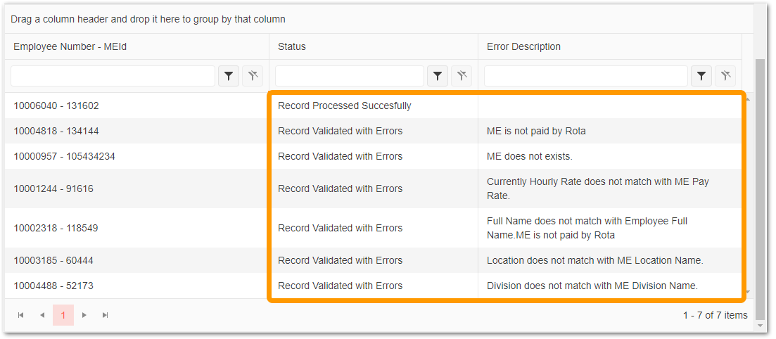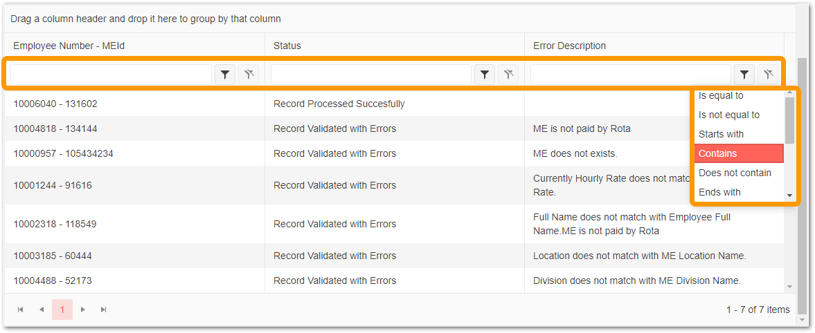When an upload has been done, and the results table presented, there are filtering options in the column headers on certain employees, used to filter out successful or unsuccessful records as well as filters on each error description: