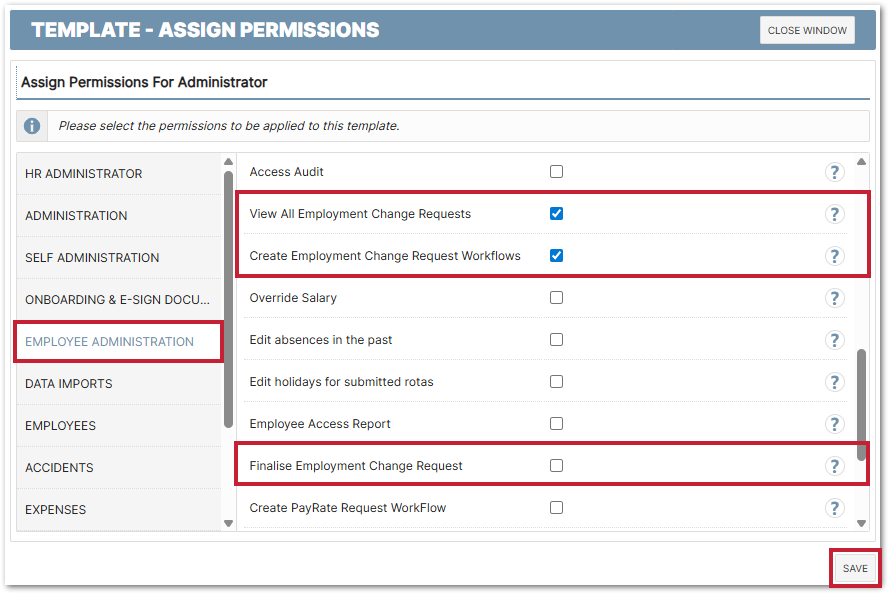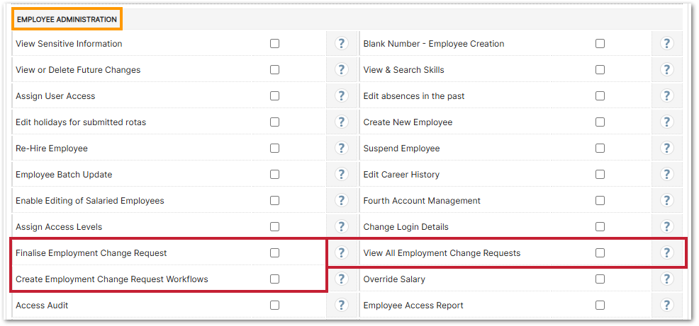 No, the Employment Change Request does not change anything pertaining to an employees access permissions. Following any change, just like if they changed details directly via Employment Details, then permission updates would need to made afterwards (if required).