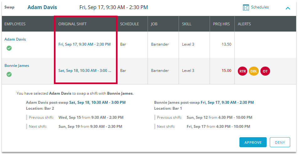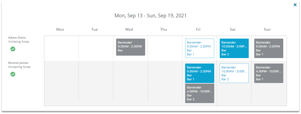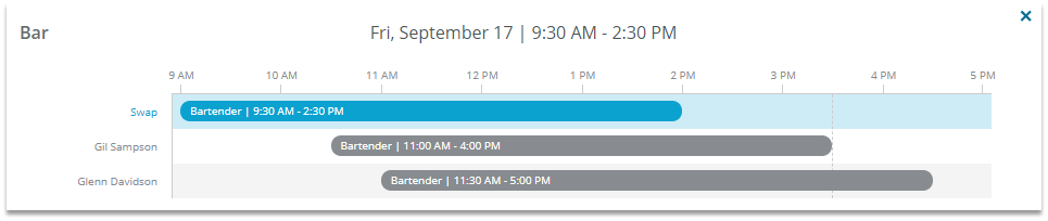 The Swap card only displays the information pertinent to the two employees requesting to swap. The main difference is that the original shift displays for both users since they have agreed to work each other's shift.
