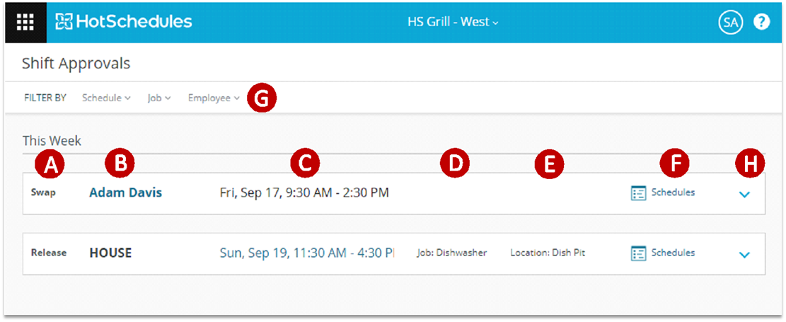 Please note: Shift swap requests will not display the job in the collapsed view, as it is required that users are assigned the same job code in order to make the request.