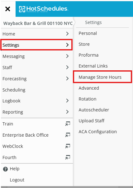 - Navigate to the Settings tab, select Manage Store Hours