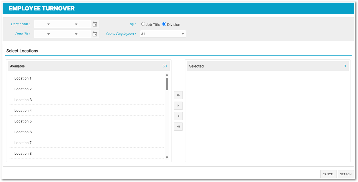 - Employee Turnover Report - offers a more granular breakdown by division and job title within each location (as well as overall totals) for a specified date range