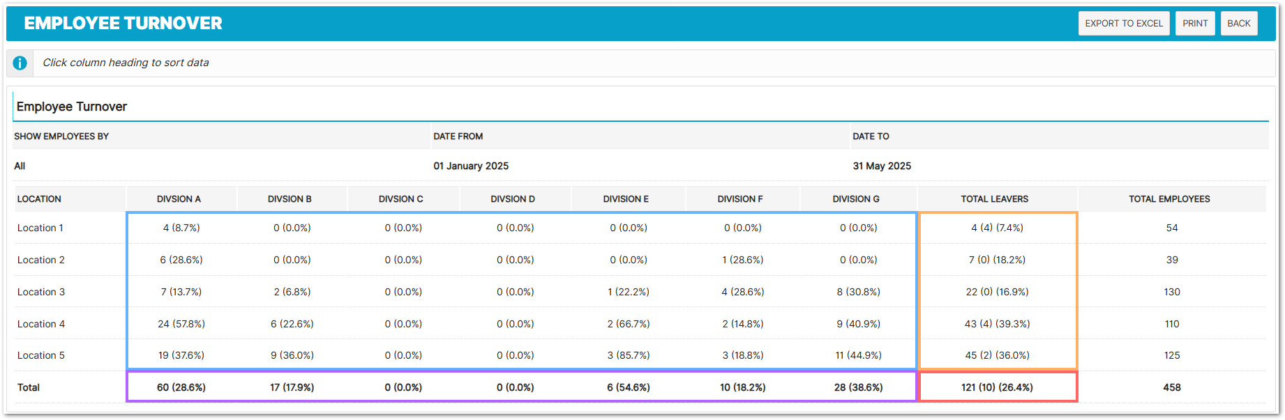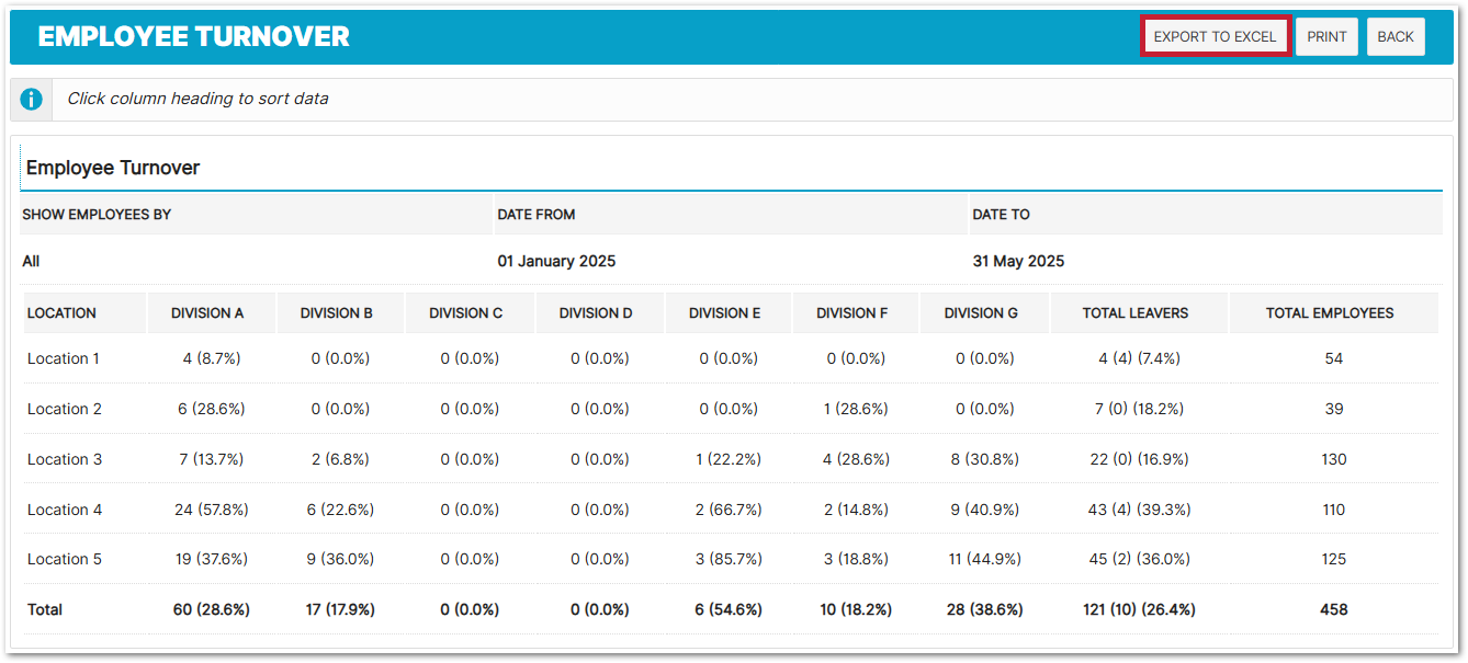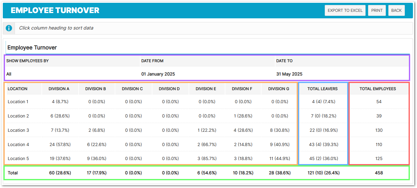 Example: "4 (8.7%)" = 4 leavers, which is 8.7% of that division's employees at that location.