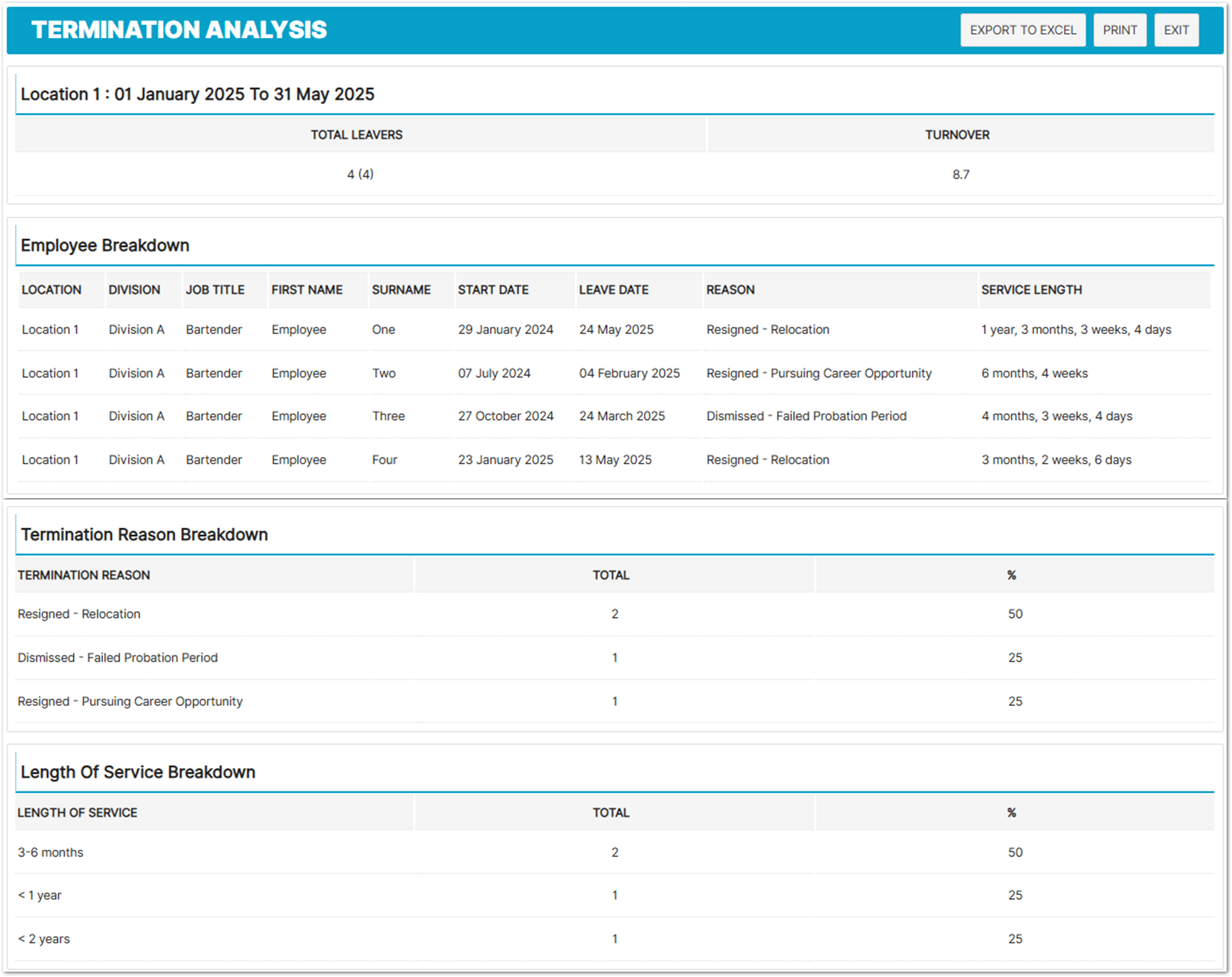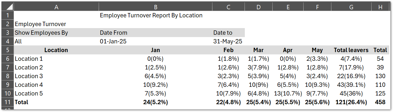 Example: The report may show "4 (13.3%)" in location row, under a particular job title (e.g. Bartender). This means 4 bartenders left, which is 13.3% of all bartenders at that location.