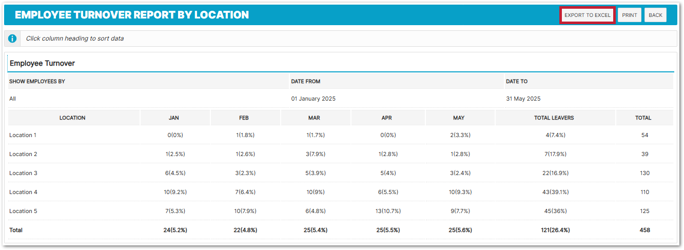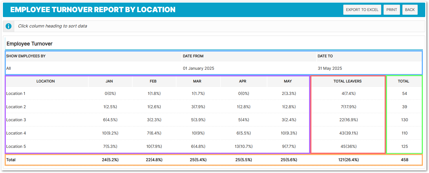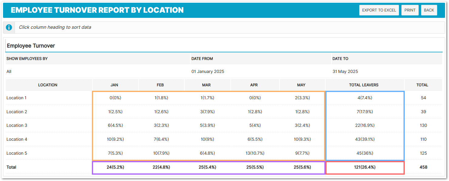 Also displays the percentage of that months workforce at the location, that have left.