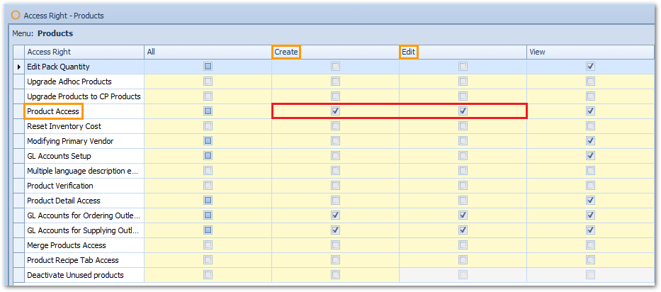 - Against 'Product Access', tick the boxes for Create and Edit