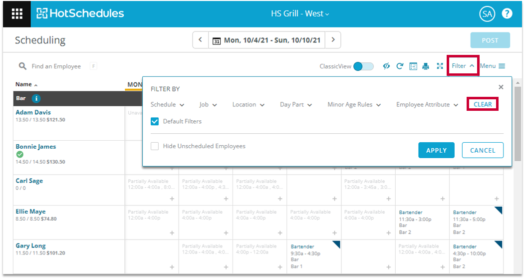 Filters allow you to limit which employees are visible to simplify your view as shifts are assigned.