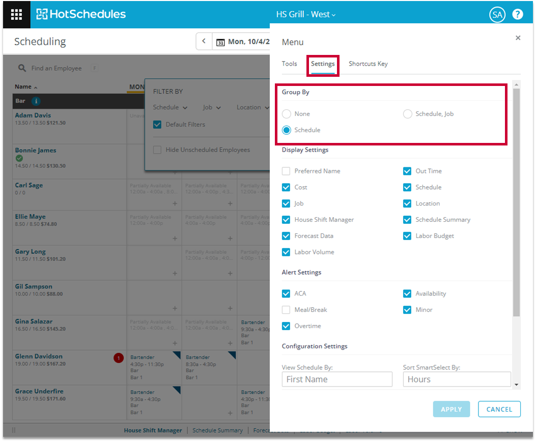 Under Group By, you can select whether the employee list should be sorted based on just their schedule or based on their job code as well: