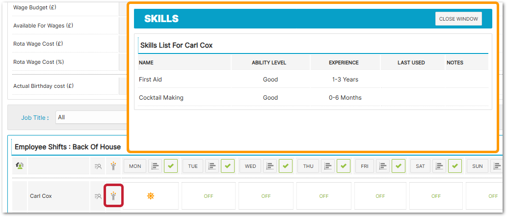 - To view an employee’s skills on the rota, select the Skills icon next to their name (see Fig.6), and a pop-up box will appear showing the information on the skills recorded