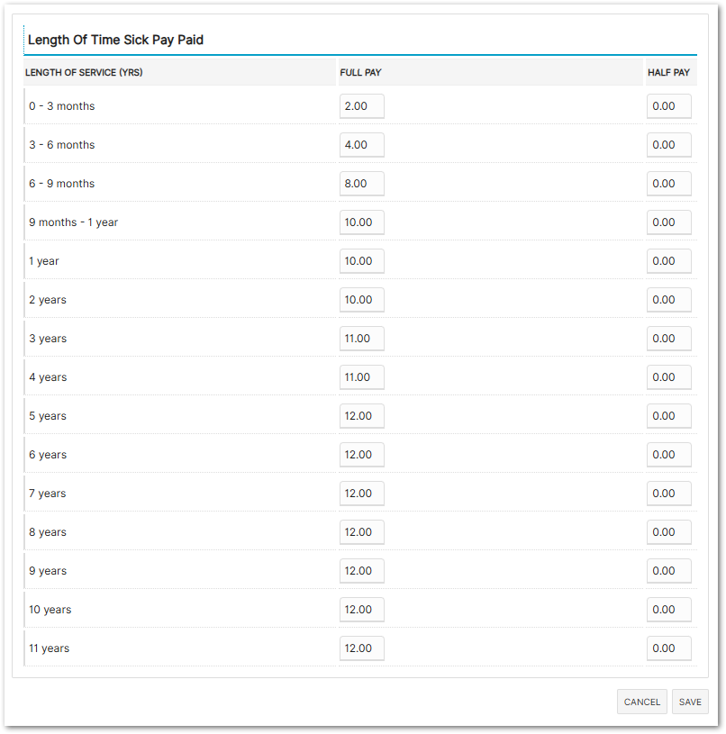 Company Sick Pay (CSP) is used when absent employees are paid at a rate more than Statutory Sick Pay. The system can be configured to pay either full or half-day salary for a specified number of days. This is set up in a contract and then applied to the employee’s Employment Details.