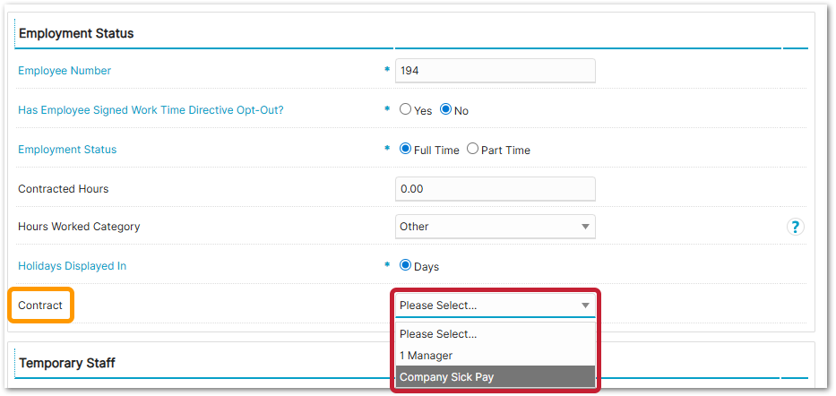 Within an employee’s Employment Details page, there is a field called ‘Contract’. The contracts created and assigned to that job title will appear in the drop-down menu.