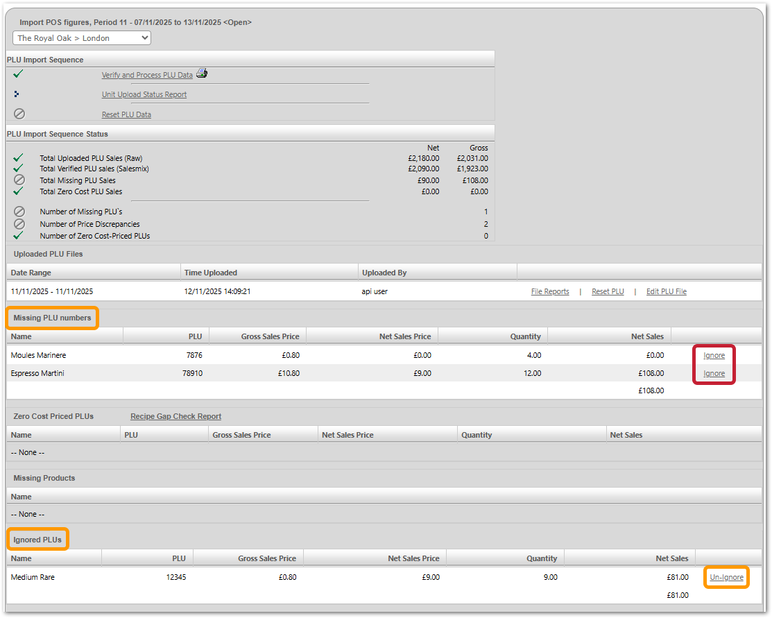 This will check for and list any missing PLU numbers, which are sales that have not been correctly linked to the system. Missing PLUs should be reported to a system administrator, though there is an option to 'Ignore' them if required.