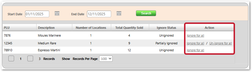 Doing this will overwrite any actions taken at Location level. A locally ignored PLU will become un-ignored if done so globally