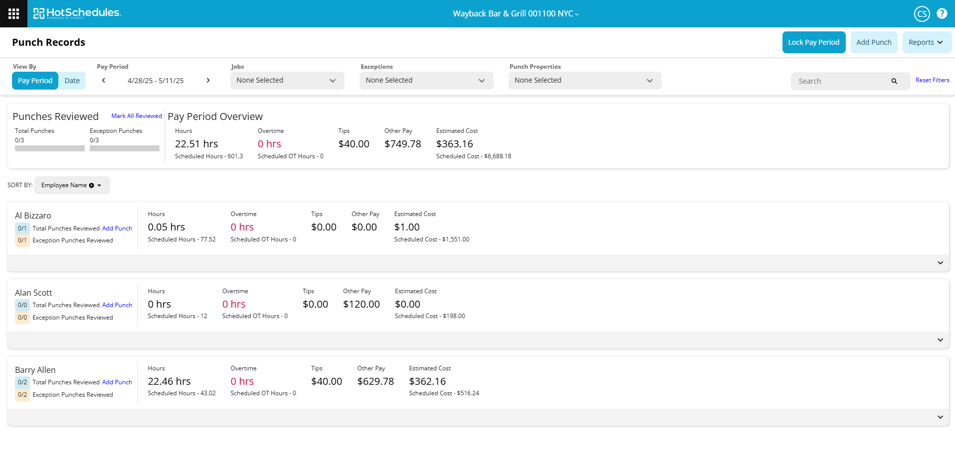 At a glance, you will be able to view hours, overtime, tips, other pay, and estimated costs for each employee. At the top of the page you will find that information totaled for all employees in view.