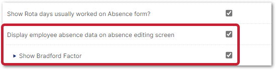 - Tick the boxes for Display employee absence data on absence editing screen and Show Bradford Factor