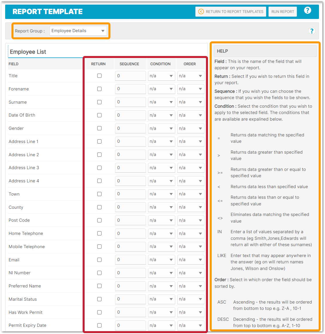 Fig.4 - 'Employee Details' group - Return, Sequence, Condition, and Order columns