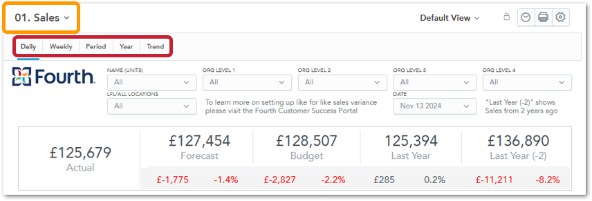 Fourth Analytics allows users to export dashboards, reports, and graphs so that the data can be further analysed and shared within their business. This article explains the ’01. Sales' dashboard – which uses sales data from the Rota module in Workforce Management (WFM).
