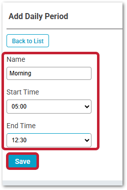 - Enter a Name, Start/End Times, and Save