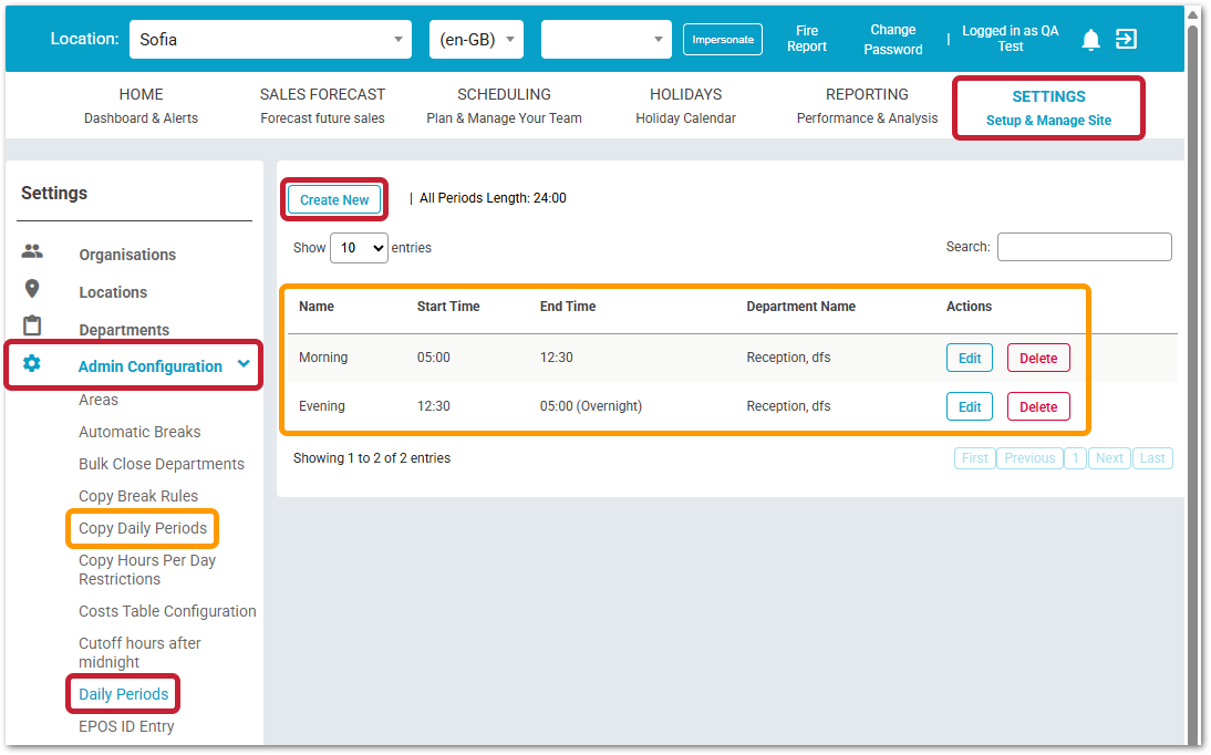 Existing Daily Periods will be listed (see Fig.2). Please note, for Locations that are set as 'Schedule departments as one', the top listed 'Department Name' will be displayed.