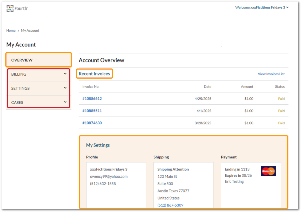 - On the left-hand side, you can navigate to three areas of the site via the Billing, Settings, and Cases tabs to manage your account