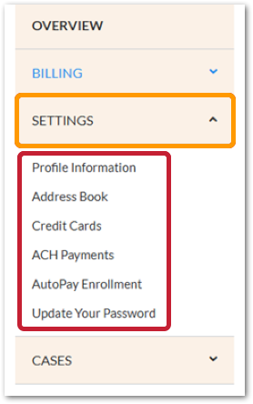 The Settings tab allows you to manage credit card, ACH, and autopay enrollment as well as review your account profile information and addresses.