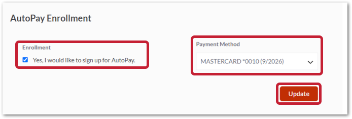 - AutoPay Enrollment - select a payment method and enroll in autopay so that there isn’t a need to come in and manually pay invoices