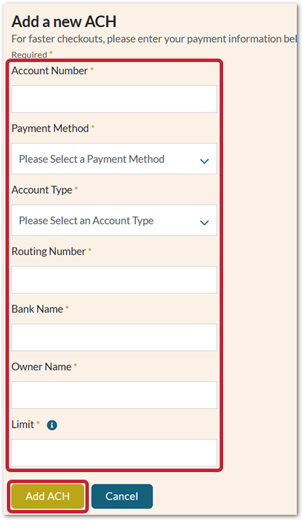 - ACH Payments - a lot like the 'Credit Cards' area, add and manage ACH details